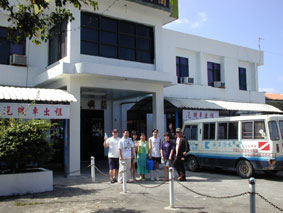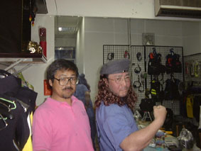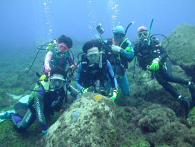毎年恒例のゴールデンウィーク台湾ツアーです。 今回は大阪滞在の不思議な北村良之さん、ユカタンこと鈴木由佳さん、 どらちゃんこと秋冨雅之君、進ちゃん先生こと鈴木進二さん、 そしてフォルモサスタッフ細川舞と不思議なアジアン松とうちゃんの 総勢6名のツアーでした! 現地で私たちをケアーしてくれたのは、 松とうちゃんの以前の部下(製薬会社)、李さん、魏さん、 取引先だったオリンパス総代理店オーナーの郭さん、 ダイビング仲間の鄭さん、紀さん、 松とうちゃんの同期インストラクターの蘭嶼島原住民、王さん など台湾の沢山の方からお手伝いいただきました。 台北での滞在は、定宿の『山水閣大飯店』 そして蘭嶼島でのホテルは『国際海洋大飯店(旧蘭嶼大飯店)』 でした。その他利用の航空会社、国際線は中華航空、 国内線は、遠東航空、復興航空、華信航空です。 その他移動の手段は、タクシー、予約のリムジン、友人の車、バス、地下鉄、 ホテルのトラック、スクーター、徒歩、と多彩です。 それでは、楽しかったツアーの内容を台湾ツアー参加5回目の 舞ちゃんインストラクターからレポートしてもらいましょう! 【舞ちゃんのツアーレポート】 かなり長い物語です。 行ってきました、見てきました、食べてきました7日間 すでに恒例となってきている台湾ツアー、あんな事も、こんな事もありました。 麗しの島『FORMOSA』での7日間のお話です フォルモサの『FORMOSA』ツアーはじまり、はじまり〜 パチパチ・パチパチ〜(拍手!) 【5月2日】 東京の空は入道雲もあり!の夏日「外は暑そうだねぇ〜」と。 そうなのです、私達は羽田空港国際線ターミナルの搭乗待合所で こんな事を話していました。 集合はチェックインカウンター前 器材の入ったトランク「ズルズル」ご苦労様 これからの7日間、この労が報われるから! あらら・・・すでに今回の旅の安全を願ってビールを いっぱいいっている人もいますが。 我らを引率するのは当然「松とうちゃん」でもねぇー、 すでに「怪しいアジアン」に変身中・・・・(・・;) 飛行機が着陸する頃にはきっと 「アジアンとうちゃん」が出来上っている頃でしょうね。 なんて考えているともう到着? 「中正国際空港」まではあっという間の3時間半です。 入国審査を終えて鼻をヒクヒク「外国の香い」! 変身完了「アジアンとうちゃん」! ゲートを抜けると「李さん」が手を振っています(^○^)/~ 「わぁ〜お久し振り〜」 これからまず、エキサイティングなドライブが私達を待っています。 一様にして「車線変更の達人」なの「ビュンビュン」交差して、 ウッウインカーは? ぶ、無事に50分後宿に到着。ふぅー。 チェックインも済ませお出迎えにきて頂いた 「李さん」と「魏さん」も合流してお食事。 ツアー初のお食事は「港式海覇王」−−−香港式ね。 筍のお刺し身・etc・煮込みトコブシ・茹で海老etc・スープ… このスープがただ者ではないの!作るのに何日もかかるらしい その旨さといったら、昔僧侶に「壁を越えてでも食べたい」と 云わせたほどの物ーー壁といったら「俗世」との壁でしょ! お肉も入っていたし … デザートも忘れちゃいけません!さっぱり系〜 シロップ漬けにしたグァバに甘すっぱーいかき氷をまぶした感じ う〜ん、どんなのかこれじゃ分からないよね … お腹もいっぱいになってお散歩しながら帰りましょう!「はぁ〜い」 パブ街も横目で見ながら、良い子に通過!すごい・皆えらい! パチパチパチ〜明日の朝が早いからねぇ お休みなさぁ〜い 実はここで、「アジアンとうちゃん」は「李さん」「魏さん」から相談事をされるら しく寄り道〜! 【5月3日】:台北曇り 朝はホテル裏の「屋台」でお食事 まず外せないのが豆乳・焼き小龍包・鶏肉飯・担麺あたりかな? さ〜私達を待っている「あおい海」へ出発しましょう! 国内線「松山機場」へ(松山空港ね)宿からはタクシーで20分くらい。 チェックインも終了、手荷物検査でつかまっちゃた … 横のカウンターで係りの人がリュックを開けてお水を取り出しなんと、 キャップまで開けてくれた!で、「飲め、飲め」とハンドシグナル・・・・ しょうがないから腰に手を当てて「グビグビ」したら、 職員皆で笑ってるーーふん! 更にフォルモサメンバーも笑ってるーーふん。 とにかく「台東」に向けてAM7:10離陸! あら?大きな飛行機のなのですが …乗客数は、日本人が半分! って、フォルモサチームがその日本人客って事で6:6なんじゃコリャ? 朝一番のフライトでお客さんが少ないのだって。 すぐに到着、ここで乗り継いで「蘭嶼島」へ。 手荷物検査でまた「飲め・飲め」サインーーーふ。 ここからの飛行機が楽しいーー! 機体には「FORMOSA AIR」のロゴ入り、すし詰め20人乗り、 波間確認低空飛行 そして、演歌の女王もビックリの膝長スモーク!!足元真っ白!! と、感動だか驚きだか分からない「感嘆の声」をあげているうちに ごう音と共に着陸。そうです、とうとう到着したのです そしてはじまりまーす「