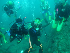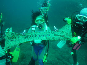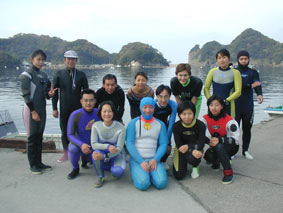 雲見温泉で日中2ボートダイビング、ビーチでナイトダイビングを終えて 宿泊の『はまゆ』で美味しい夕食を楽しみ、翌日田子に移動し、 2ボートダイビングの豪華な美食ツアーでした。 参加者は、武内さん、森廣さん、鈴木さん(AD講習)、吉津さん、上野さん、 秋冨君、土屋さん、山本さん、加藤さん(AD講習)、近藤さん、鍬田さん、エリカさん そしてスタッフの細川、松橋で総勢14名でした。 ![]() 『雲見温泉漁港前の集合写真』 初日一本目、雲見の牛着岩にてダイビング! 天気は良好、水温23度、透明度8〜10mでコンデション良好でした。 牛着岩中央のトンネルをくぐり北側の沖方向へ進んで土屋さんの100本記念の 撮影です。とっても嬉しそうな土屋さんでした! ![]() 『100本記念の土屋さん!』 2本目は、外海が北西の風がやや強く波がありましたので、沖の根でのダイビングを 断念し、再び牛着岩の回りを左回りで半周しました。そこで大事件発生! マジシャン『ヨッシー』のおろし立てのオリンパスのデジカメに、水中でハウジングを 開けることなく水を入れるマジックです。あ〜ら不思議、 見る見るうちに海水が入るではありませんか? マジシャン『ヨッシー』も、自分のマジックの腕に酔いしれていました。 ![]() 『踊るアホーに見るアホー!?』 夕方、6時には港のビーチでナイトダイビングを楽しみました。 気温は20度くらいに下がりましたが、水温は依然と23度と快適です。 浅場では、珍しく太刀魚を発見!感激です!その他、ミナミホタテウミヘビ、 ダイナンウミヘビ、ハナアナゴ、伊勢エビ、コロダイの幼魚、 タテジマキンチャクダイの幼魚、タコやソメンヤドカリなどたくさんの生物を 観察しました。水中ライトを消しての夜光虫も綺麗でした!