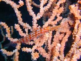 平日の北川温泉ツアーでした。 参加者は、土屋さん、秋冨君にスタッフ松橋の総勢3名です。 天気は晴れ気温13度、風はほとんどなく海は穏やか、水温15度、透明度10mの 良いコンデションでした。 昨年から根付いた『クダゴンベ』の大小2匹は健在です。 カメラを向けてもポーズを決めてじっとしていてくれました。 深場のムチヤギがとても奇麗で、中層を泳いでいたアオリイカの群れも 美味しそうでした!マツカサウオがやたらと多く、あちらこちらでみることができました。 ダイビング間の休憩とダイビング終了後は、露天の温泉で暖まり極楽です。 帰りは回転寿司『伊豆太郎』で昼食をとりましたが、4時過ぎには東京青山の ショップでログつけというのんびりした平日ツアーでした。 |