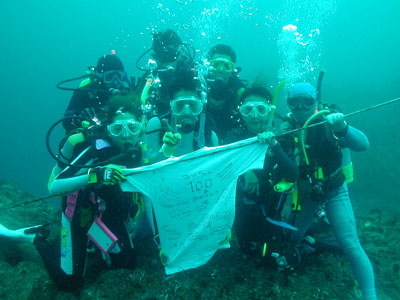 今回のツアーは、伊豆高原にお泊まりをして、 東伊豆と神子元、そして西伊豆の雲見を潜る伊豆半島ラリーツアーでした。 【参加者は】 福田さん、山本さん、田村さん、上野君、曽我部君、秋冨君、近藤さん、 山下さん、鈴木(進)さん、丸山さん、新井さん、 そしてスタッフ細川と松橋の総勢13名でした。 まず初日は、細川(おサルさん)チームの 山下さん、鈴木(進)さん、丸山さん、新井さんの5名組と、 松橋(タヌキ)チームの 福田さん、山本さん、田村さん、上野君、曽我部君、秋冨君、近藤さんの8名組 に分かれ、おサルさんチームは、大川温泉にボートダイビング。 タヌキチームは、神子元にボートダイビングと別行動でした。 夕方、菖蒲沢で両チームが合流し、伊勢エビ漁のため港内でナイトダイビングです。 ナイトダイビング終了後は、宿泊の別荘(2棟)近くの寿司居酒屋で夕食をすませ、 夜は別荘で軽く宴会です!(翌日早いので早めにおひらきにしました) 2日目は、6時半過ぎには伊豆高原を出発、下田・松崎経由で 雲見に向かい、8時45分には到着。 全員で、1本目『牛着岩』を潜り、2本目は タヌキチームが外海の『沖根』に、 おサルさんチームは、再び『牛着岩』に潜りました。 2本目は、近藤さんの100DIVE記念で、4〜8ノットはあろうかという 強い流れの中、記念の水中撮影会を行いました! 近藤さん!100本記念おめでとうございます。 今回のツアーでは、20日金曜日にSONYから新発売の デジタルカメラ『サイバーショットP1』の水中での撮影テストを行いました。 専用ハウジング『マリンパック』は、未発売ですが、 試作品はテストの結果、操作性・防水性ともに良好な結果でした。 【ダイビングログ】 ※データのみ記載しますのでツアー参加者は参考にして下さい。
