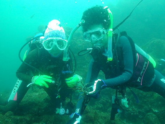 【参加者とツアー内容】 体験ダイビングで参加の丸山さん、 SDダイバーになったばかりの平賀さんがAD講習で参加、 ファンダイビングは、進ちゃん先生、そしてDM講習中の森廣さん、ゆかたん、 スタッフは舞ちゃん、松橋の総勢7名参加のツアーでした。 丸山さんと進ちゃん先生は、12日交通渋滞のの中、田子港に直接集合、 その他は、前日11日の夜、黄金崎研修センターに宿泊しました。 台風9号の接近が心配されましたが、海上は比較的穏やかで、 『沖根』に2回、『弁天島』に1回、そして体験ダイビングは、 前浜などのビーチに2回入りました。 水温は、水面と深場で大きく異なり、18〜24度くらい、 透明度は8〜12mくらいでした。 今回も参加者全員、楽しめたツアーでした! |