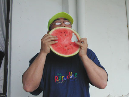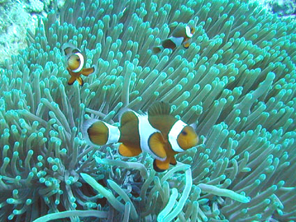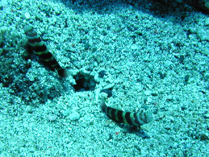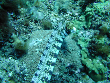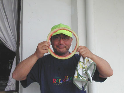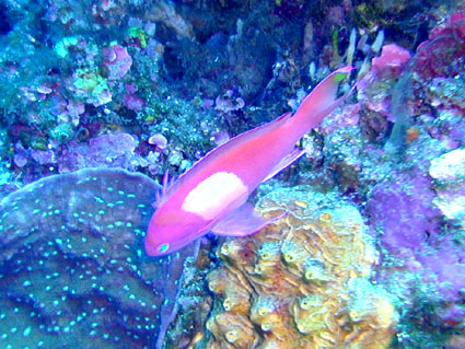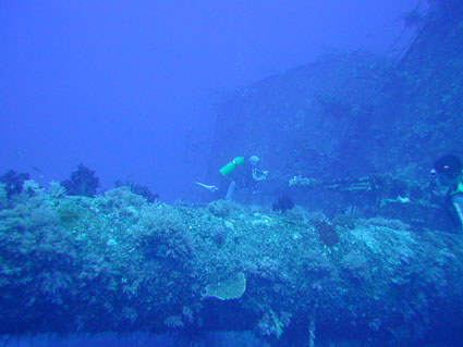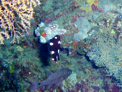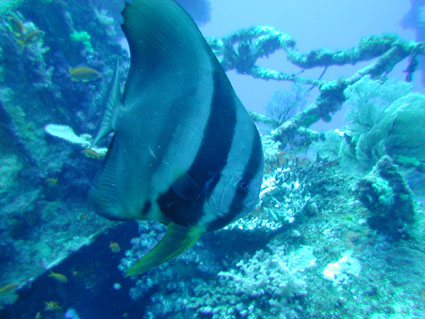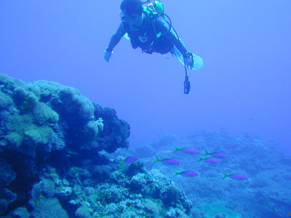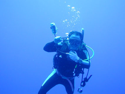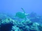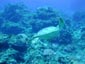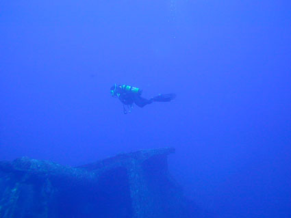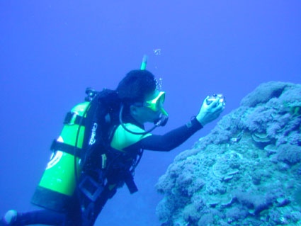 今回のGW恒例台湾ツアーは4月29日朝出発の丸々5泊6日ツアーでした。 中華三昧のとにかく美味しい!きれい!楽しいツアーでした!! 【1日目】 羽田空港に朝7時半集合、参加者全員遅刻もなく胸を高鳴らせての集合でした。 空港で顔を合わせるなり、まずはビールで乾杯!ツアーのブリーフィング開始。 11時半の台北国際空港には、松とうちゃんの友人李さんと送迎用のレンタルワゴンが 運転手付きでお迎えです。 昼食は、国際空港近く大園郷のレストランで台湾料理です。 何もかにも美味しい!ビールがすすみます。 昼食後、台北に入り山水閣大飯店にチェックインし、 松とうちゃんは米国の製薬会社(台湾工場)の社長と打ち合わせ、 他の参加者は、レンタルワゴンの運転手に連れられ中正記念堂の衛兵交代を見学。 中正記念堂からは、歩いて和平公園を突き抜け台北駅前のランドマークタワー(超高層ビル) 30秒で昇るエレベーターに乗り台北市の景色を一望しました。 午後6時半には、『湘厨』で参加者と松とうちゃんの元秘書魏さん、李さん家族が集合、 総勢10名で湘南料理の夕食を楽しみました。 夕食の後、台湾一の玩具市場で買い物。その後、舞ちゃんと田村さんは、 ただ今、日本観光客に人気の台湾足裏マッサージへ。 他の男性軍は、近くの台湾パブで一杯です。 9時半頃には再び全員集合で11時くらいまで飲みホテルに帰り就寝です。 【2日目】 朝5時半に、ホテル近くの市場の屋台で朝食。 7時には、松山国内空港に到着、8時10分発の 台北−台東の国内線航空機(立栄航空)に搭乗し、台東でしばし休憩。 お昼前の11時半には蘭嶼島の空港に到着。 蘭嶼空港では、松とうちゃんの友人王さんが出迎えてくれ 蘭嶼飯店の送迎車でホテルに入り、チェックイン後、ホテルで昼食です。 昼食をとり、休憩後、いよいよダイビングです。 『1本目』:椰油小港 まずは、ホテル近くのビーチで、250〜300mの水面スノーケル移動。 気温31度、ウエットの中は海水に浸かっているのに汗ビッショリです。 水深20mの棚と水深40mの海底が水面から覗けます。 水温28度、透明度35mの透き通った海中を、全員空中を舞うように降下していきます。 ドロップオプには、スミレナガハナダイ、カスミチョウチョウウオが乱舞し、 水深15m近くのサンゴ礁には、ダイバーに慣れている キスジゲンロクダイが群れで我々ダイバーに寄ってきます。カメも近づいてくれました。 最大深度39m、潜水時間53分の気持ちいいダイビングです。 『2本目』:ダブルライオン ホテルからポイントまでは、ホテルのレンタルトラックを借り移動。 ブーツ底に穴のあいている田村さんには、ちょっときつい岩場に移動が約150m やはり、エントリー前はウエットの中は汗ビッショリです。 急な坂道を転がるようにサンゴ礁をかけ下がり、トップが水深20m根底が30mの 隠れ根の周りと、隠れ根中央のアーチを探索。根の周りには、キンギョハナダイが すごい群れで我々の目を楽しませてくれます。タテジマキンチャクダイ、 サザナミヤッコ、カスミチョウチョウウオもたくさんです。 中層には、ヒレナガカンパチが泳いでいました。 大きな隠れ根2つを移動し、透明度40m、水温28度、 最大深度31m、潜水時間41分のダイビングでした。 6時半にはホテルで夕食をとり、11時近くまで飲んでいたような気がします。 【3日目】 7時半に朝食をホテルでとり、8時半にはダイビングに出発です。 『3本目』:玉女石 比較的エントリーし易い小さな池のような入り江から沖に向かい 水中移動すること10分で目的の大きな根に到着します。 大きな根の底には、根を横断する見事なトンネルがあります。 ここでも、ヒレナガカンパチを見ました。 水温28度、透明度30m、最大深度21m、潜水時間50分のダイビングでした。 『4本目』:開元港 港の桟橋からジャイアントストライドでエントリー、後は港の正面にある小島に向かい 水中移動約5分。サンゴ礁のきれいなところですが、大きな岩の下3方向から入れ、 トンネルのトップには直径3mくらいの出口があります。 縦穴、横穴がある面白い地形です。トンネル底の岩の割れ目には 伊勢エビがうじゃうじゃいますが、狭すぎて届きません。 トンネルを抜けて深場に向かうと、ウメイロモドキの群れがきれいでした。 ヒレナガカンパチも見れました。最大深度30m、潜水時間52分、透明度40mです。 蘭嶼島2日目の昼食は、ホテル前のレストランでいただきました。 昼食後、ゆっくりと昼寝をし、再びダイビングです。 『5本目』:五孔洞 やはり、田村さんのブーツではきつい岩場の移動が50mくらいです。 海面すれすれからドロップになっている岩のすき間からジャイアントストライドで エントリー、あとは海底から水面近くまで上に伸びたサンゴの柱の間をくぐり 沖へ向かいます。お魚はさほどいませんが、地形の面白いところです。 水温28度、透明度30m、最大深度22m、潜水時間50分のダイビングでした。 『6本目』:椰油小港 もしや夕食後、ナイトダイビングか?と思い下