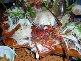 田子漁港前では、田子の『産業祭り』が開催されており、にぎあっていました。 ダイビングの休憩中には、無料の伊勢エビのみそ汁を頂戴し、身体が温まりました。 2本目は、『はえあわせの根』でダイビング!こちらも透明度は12mくらいです。 根と根を渡るゆったりとしたダイビングでした。アオリイカの群れ、キンギョハナダイ、 テンジュクダイやネンブツダイの群れが綺麗でした。 12時には、ダイビングを終え、後かたづけの後、いつもの三共食堂『小鰺寿司』 で、昼食をとりました。2階の広間でフォルモサの貸し切りです。 2日間のロギングをしながら昼食を楽しみました。 ![]() 『三共食堂2階にて』 東京のショップには、7時過ぎに戻り、ツアーで撮影したビデオやデジカメの 映像・写真を鑑賞し、9時頃から六本木の居酒屋『焼き三昧』で打ち上げでした。 最後まで宴会好きなツアー参加者たちでした。 |