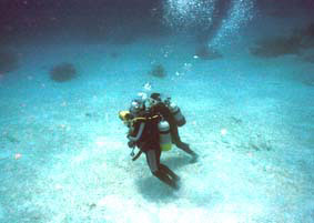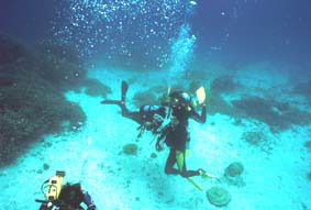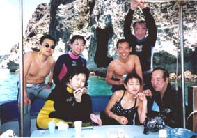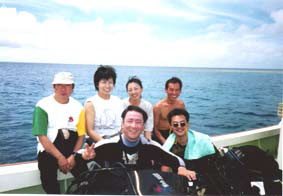 そしてスタッフ細川インストラクターの計7名のツアーでした。 少し南風がありましたが天候に恵まれ、ゴンデションはgoodでした! 伊良部島と八重干瀬を中心に潜りましたが、海面はとても穏やかで、水温も27度と快適です。 伊良部島のガケ下では、宮古で唯一のエアードームと言われる海底洞窟に入りましたが、 神秘的で不思議な空間です。 L字アーチでは、お目当てのロウニンアジに会えず残念でしたが、こちらも 面白い地形です。 八重干瀬の砂地とサンゴの風景は、のんびりフィッシュウオッチングを楽しめました。 やはり、沖縄宮古島は伊豆とはひと味違う快適ダイビングでした。 夜は、沖縄料理で宴会の毎日で、楽しいひとときを過ごしとても満足です。 また、行きた〜い!! |